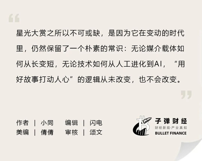 星光大赏之所以不可或缺,是因为它在变动的时代里,仍然保留了一个朴素的常识:无论媒介载体如何从长变短,无论技术如何从人工进化到AI,“用好故事打动人心”的逻辑从未改变,也不会改变。