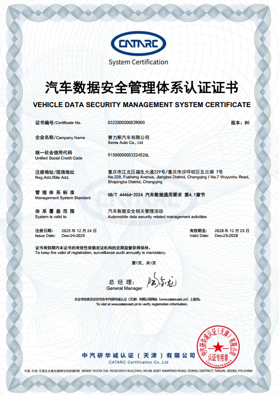 在智能网联汽车技术高速迭代、软件与智能化功能爆发式增长的行业浪潮下,车辆运行、智能交互及服务体验等环节衍生出海量用户信息与车辆数据。数据安全直接关系用户权益与出行安心,更是企业践行责任、赢得用户信任的核心基石。近日,赛力斯率先获得全国首批汽车数据安全管理体系认证证书,本次认证基于国家市场监督管理总局、国家标准化管理委员会正式发布的GB/T44464-2024《汽车数据通用要求》国家标准,由权威第三方机构开展全面评估。