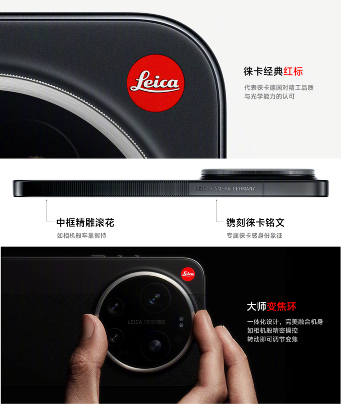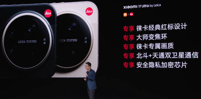 官方介绍小米17 Ultra徕卡版由德国团队原班人马操刀设计,提供黑色、米白色两个颜色,设计灵感源自徕卡M系列相机,后盖均为荔枝皮纹理+哑光拼接设计,有立体的徕卡红标,机身中框有精雕滚花设计的徕卡铭文,镜头有机械设计的大师变焦环,可以调节白平衡、变焦范围、曝光等等,相机界面提供“徕卡一瞬”模式,提供徕卡M3和徕卡M9两大相机模拟风格,机身厚约8.46mm,重约229.8g,支持北斗、天通双向卫星通信。