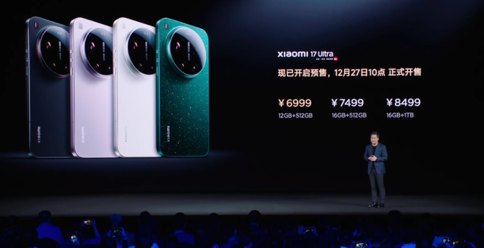 价格上,小米17 Ultra:12+512GB版售价6999元,16+512GB版7499元,16GB+1TB版8499元,现已开启预售,12月27日10点正式开售。