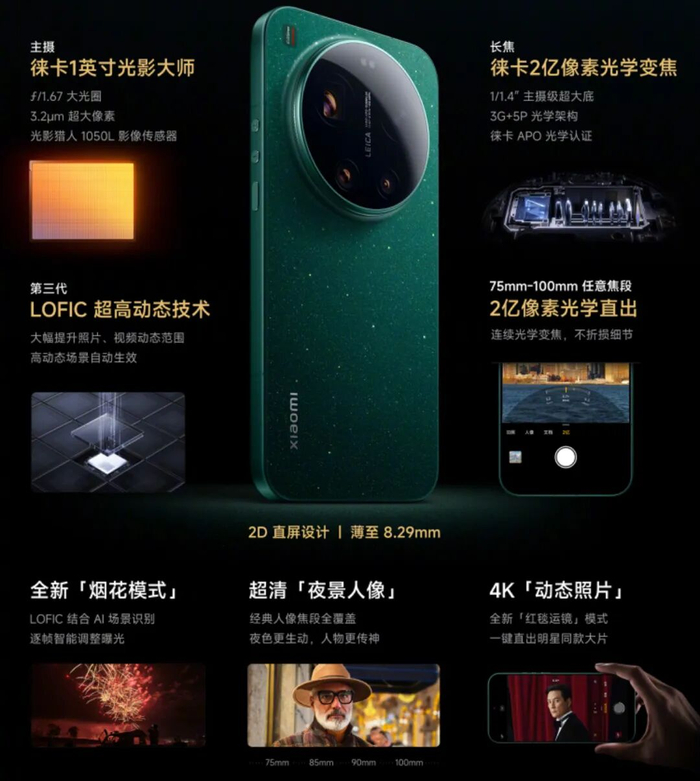 小米17 Ultra主要配置:6.9英寸2608*1200分辨率的居中单挖孔四等边直屏,全新M10发光材料,超级像素方案,420ppi,1-120 LTPO刷新率,2160Hz PWM调光+DC调光, 局部峰值亮度3500nits,小米龙晶玻璃3.0盖板,超声波屏下指纹,金属直角中框,玻纤后盖,黑色、白色、星空绿、冷烟紫4个颜色,机身三围162.9*77.6*厚约8.29mm,重约223.4g/绿色重约224g。