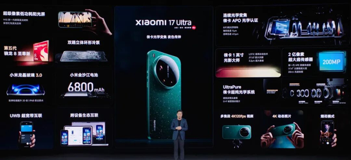 核心配置上,小米17 Ultra搭载骁龙8 Elite Gen5,LPDDR5X、UFS 4.1,6800mAh电池,小米澎湃P3智能快充芯片、G2电池管理芯片,90W有线充、50W无线充,立体双扬,X轴线性马达,支持IP66/IP68/IP69防水,USB 3.2接口,支持NFC、红外遥控、UWB,还有小米澎湃T1 & T1P & T1S通信芯片等等。