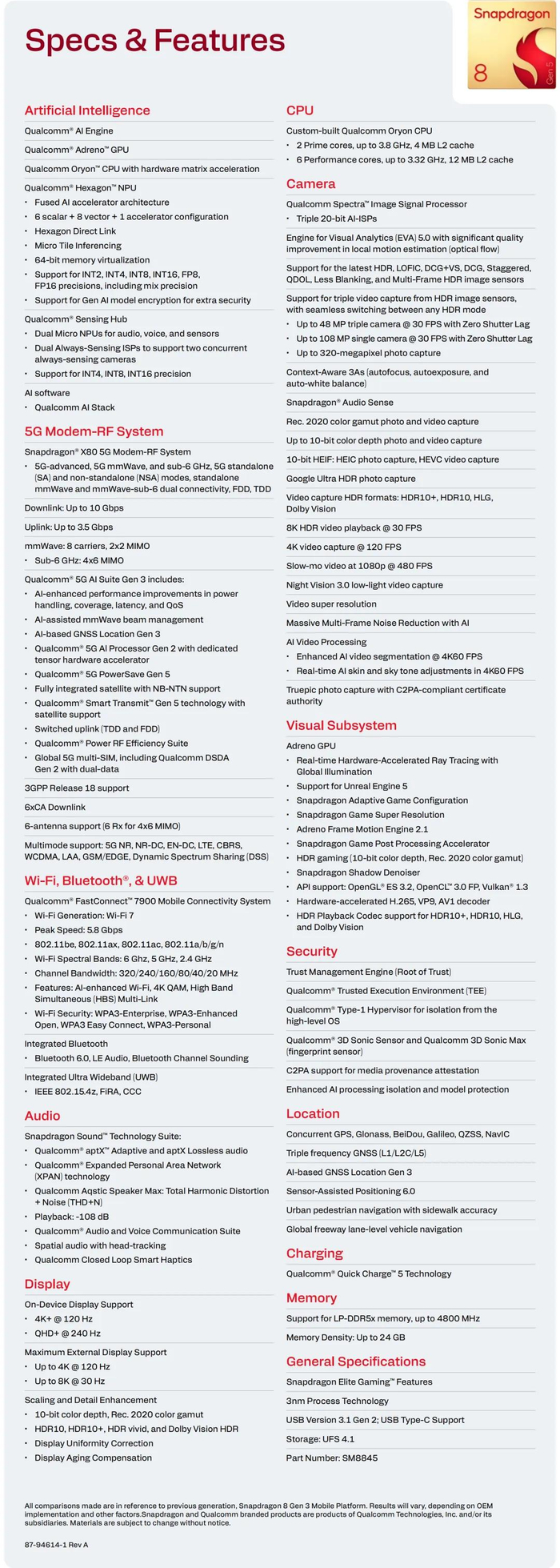 基础规格上,骁龙8 Gen5采用台积电N3P工艺制程,CPU采用全新一代的Oryon,2+6设计,频率最高3.8GHz,超大核缓存4MB,大核缓存12MB。GPU是Adreno829,规模是骁龙8 Elite Gen5上Adreno 840的2/3,频率1.2GHz。