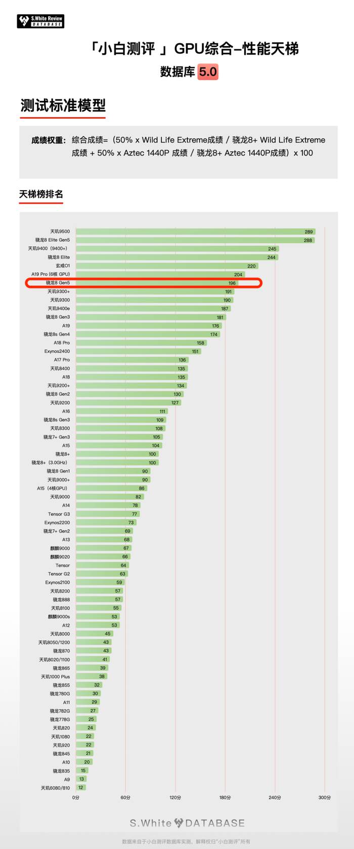 GPU表现:综合性能196分;综合能效210.3分,介于骁龙8 Gen3和骁龙8 Elite之间。