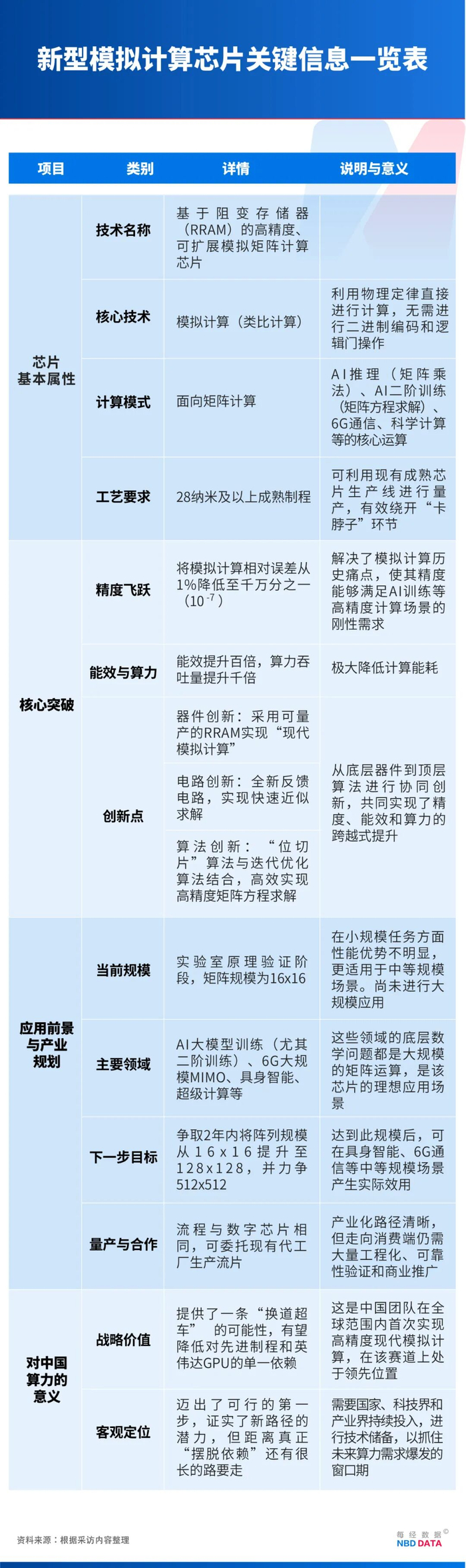 这是一种完全不同于目前所有商用量产芯片的新型芯片,计算精度从1%跃升至千万分之一;可以支撑6G、具身智能及AI大模型训练等多个前沿场景;更重要的是,它可在28纳米及以上成熟工艺量产,绕开光刻机“卡脖子”环节。