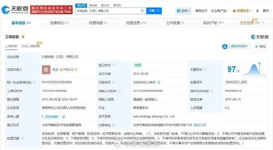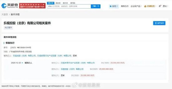 12月31日,潇湘晨报记者查询天眼查法律诉讼信息显示,近日,乐视体育文化产业发展(北京)有限公司、乐视控股(北京)有限公司、贾跃亭新增一则恢复执行信息,执行标的2000万人民币,执行法院为广东省深圳市中级人民法院。