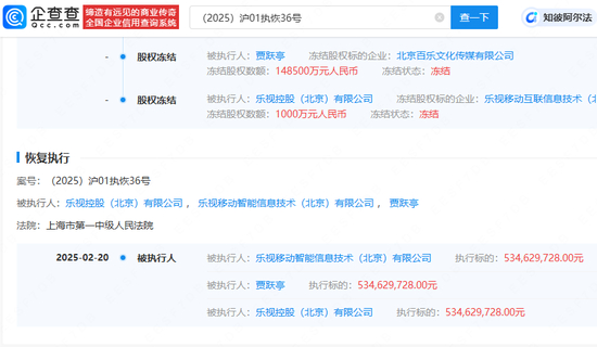 2月20日,乐视控股(北京)有限公司、乐视移动智能信息技术(北京)有限公司、贾跃亭被上海市第一中级人民法院恢复执行约5.34亿。据悉,该案涉及一起企业借贷纠纷,其中乐视控股公司由贾跃亭持有约92.07%股权。