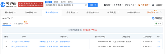 此前据媒体报道,2月14日,乐视网信息技术(北京)股份有限公司新增一例被执行人信息。此次执行标的高达1.1亿余元,执行法院为北京市朝阳区人民法院,案号为(2025)京0105执6968号。