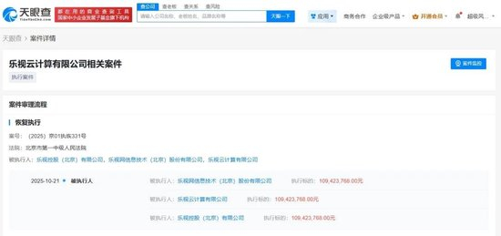 10月22日,据读秒财经报道,天眼查天眼风险信息显示,10月21日,乐视控股(北京)有限公司、乐视网信息技术(北京)股份有限公司、乐视云计算有限公司新增一则恢复执行信息,执行标的1.09亿余元,执行法院为北京市第一中级人民法院。