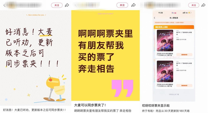 测试期间,不少用户在社交媒体分享使用体验,频频称赞“大麦真的听劝!”“朋友抢的票自己也能看到了,终于不用再要截图了,安全感拉满!”