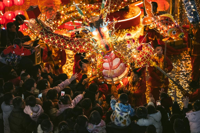 成都举办“焰舞迎新辰”跨年活动,“丰顺埔寨火龙”巡游吸引了大量的游客前来围观拍照。