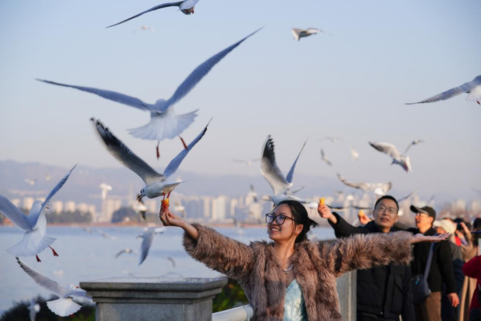 市民和游客在云南昆明滇池海埂大坝投喂红嘴鸥,观赏滇池风光,度过新年假期。