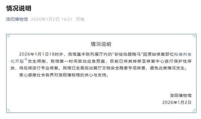 ·唐代彩绘贴金陶马碎了?洛阳博物馆发布情况说明:因原始修复部位粘接剂老化开裂发生倾倒。