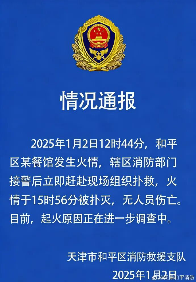 ·天津和平区一餐馆发生火情,消防通报:无人员伤亡。