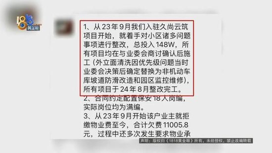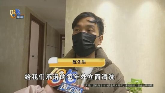 陈先生:给我们承诺的每年外立面清洗,每年11月份到现在,也可以看到我们窗户这种东西,都是很脏的。然后说是自行车下地库有阳光雨棚,它也没有做。我们为了大家进出方便嘛,在人员编制上,他们当时承诺的大概十几个保安,这种东西可能具体有没有,我们晚上也看不到几个人。